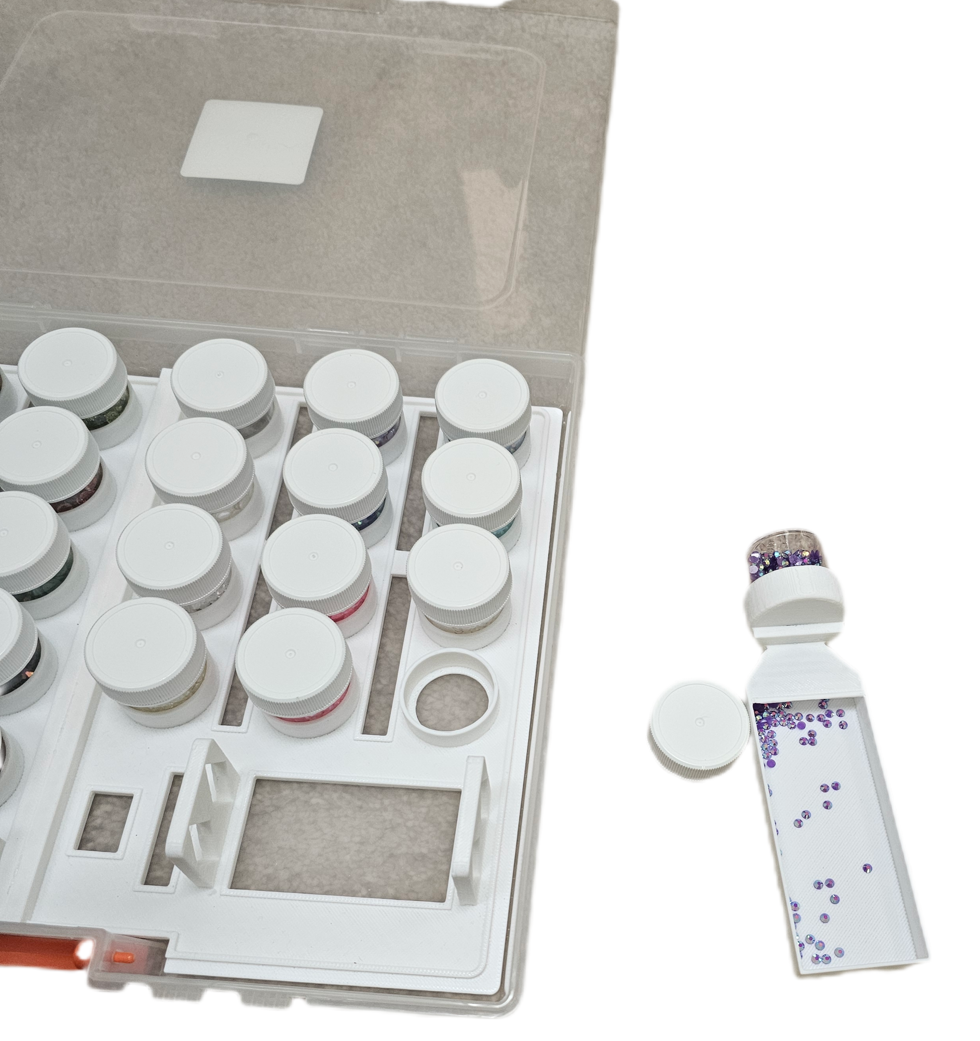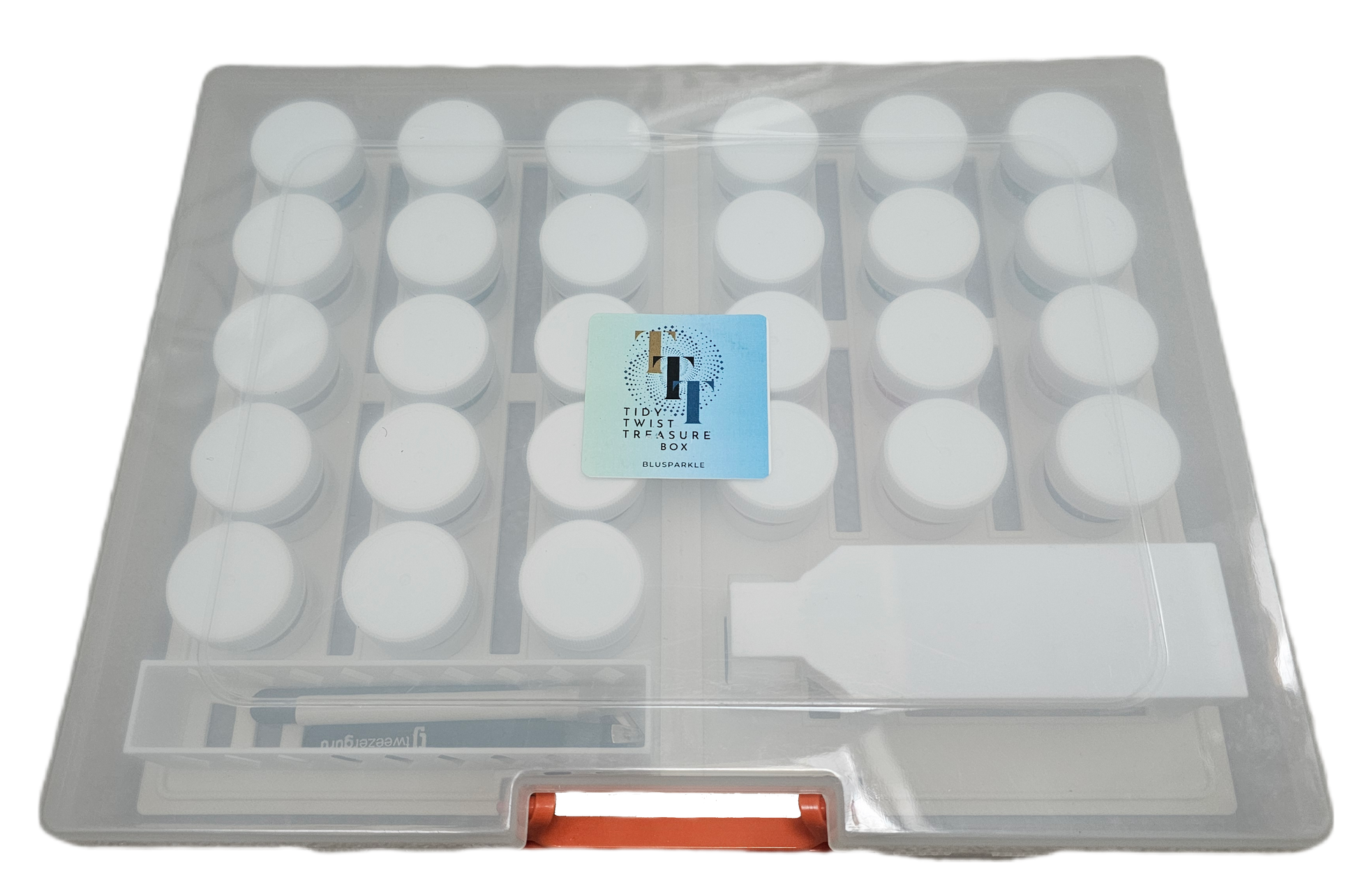 Each jar screws securely into the BluSparkle tidy twist tray, letting you pour gems, sequins, and rhinestones in and out without the mess. No more spills. No more chaos. Just tidy, satisfying sparkle sorting.